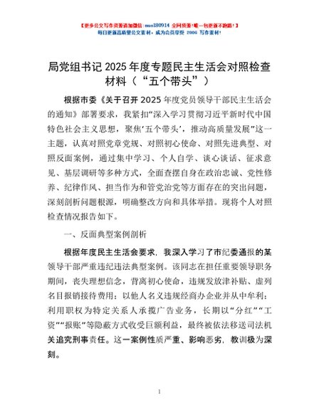 / 局党组书记2025年度专题民主生活会对照检查材料(“五个带头”)
