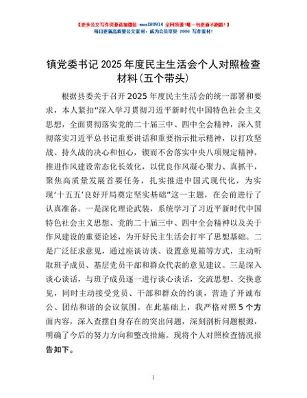 / 镇党委书记2025年度民主生活会个人对照检查材料(五个带头)