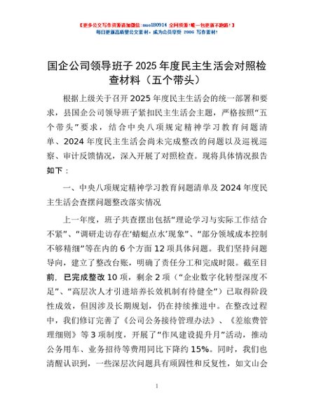 / 国企公司领导班子2025年度民主生活会对照检查材料(五个带头)