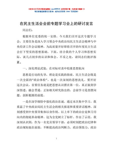 / 在民主生活会会前专题学习会上的研讨发言