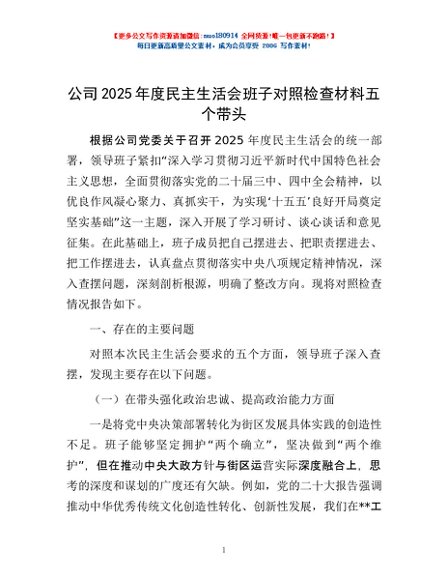 / 公司2025年度民主生活会班子对照检查材料五个带头