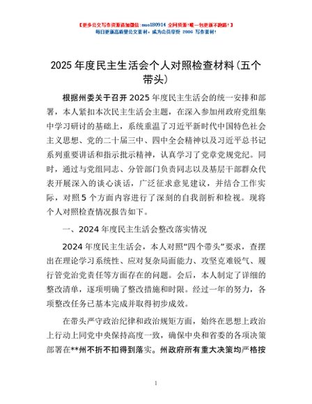 / 2025年度民主生活会个人对照检查材料(五个带头)