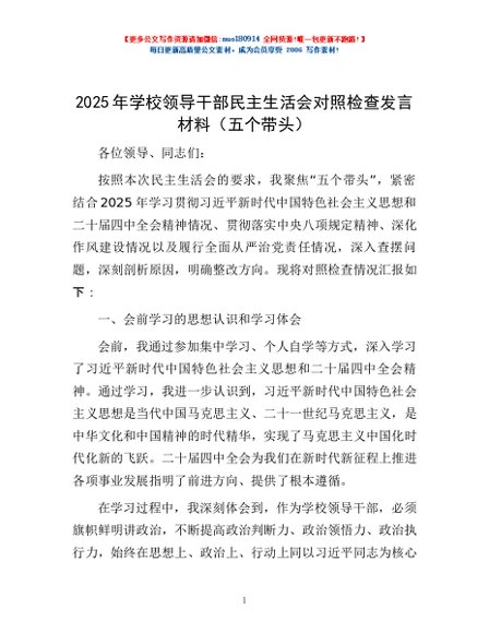 / 2025年学校领导干部民主生活会对照检查发言材料(五个带头)