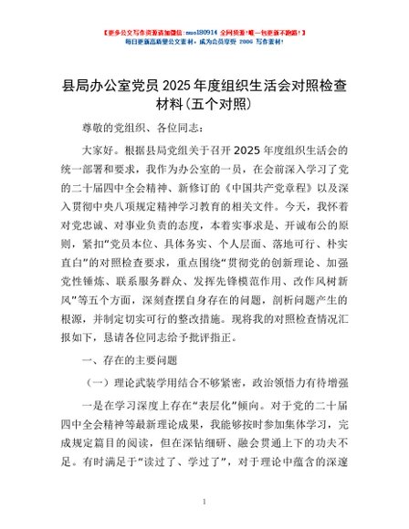 / 县局办公室党员2025年度组织生活会对照检查材料(五个对照)