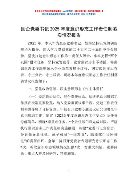 / 国企党委书记2025年度意识形态工作责任制落实情况报告