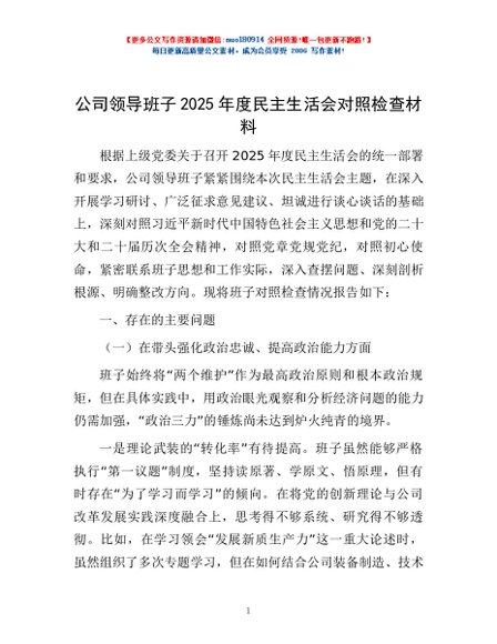 / 公司领导班子2025年度民主生活会对照检查材料