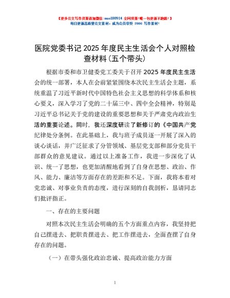 / 医院党委书记2025年度民主生活会个人对照检查材料(五个带头)