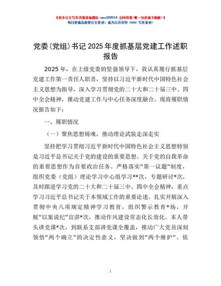 / 党委(党组)书记2025年度抓基层党建工作述职报告