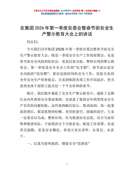 / 在集团2026年第一季度安委会暨春节前安全生产警示教育大会上的讲话