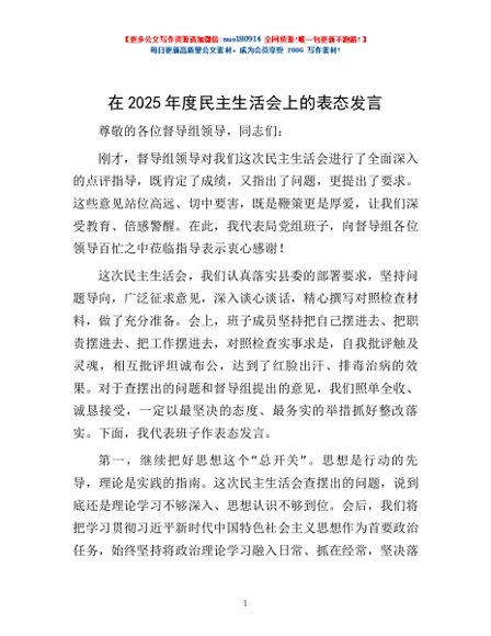 / 在2025年度民主生活会上的表态发言