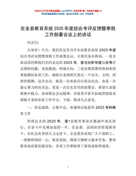 / 在全县教育系统2025年度综合考评反馈暨寒假工作部署会议上的讲话