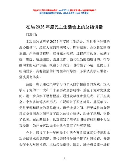 / 在局2025年度民主生活会上的总结讲话