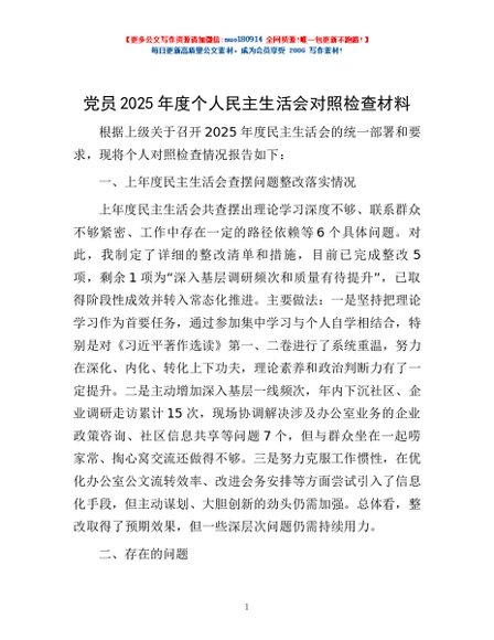 / 党员2025年度个人民主生活会对照检查材料