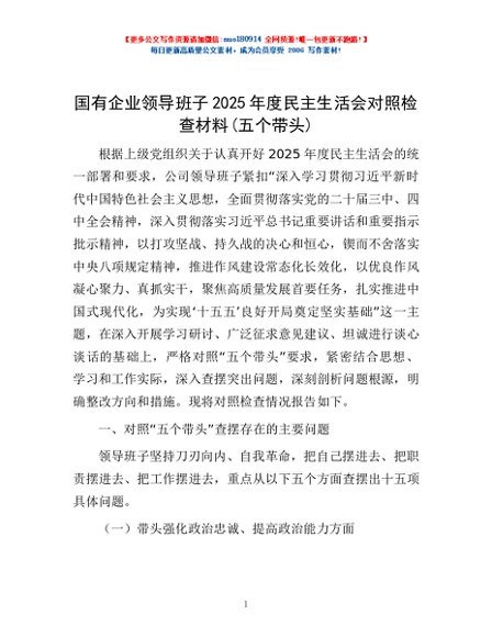 / 国有企业领导班子2025年度民主生活会对照检查材料(五个带头)