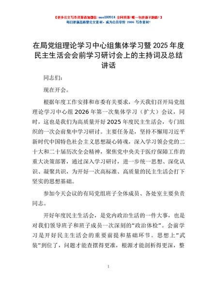 / 在局党组理论学习中心组集体学习暨2025年度民主生活会会前学习研讨会上的主持词及总结讲话