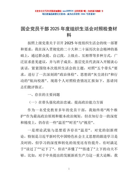 / 国企党员干部2025年度组织生活会对照检查材料