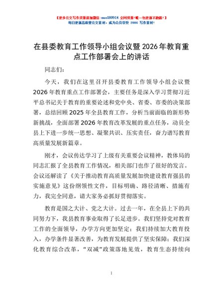 / 在县委教育工作领导小组会议暨2026年教育重点工作部署会上的讲话