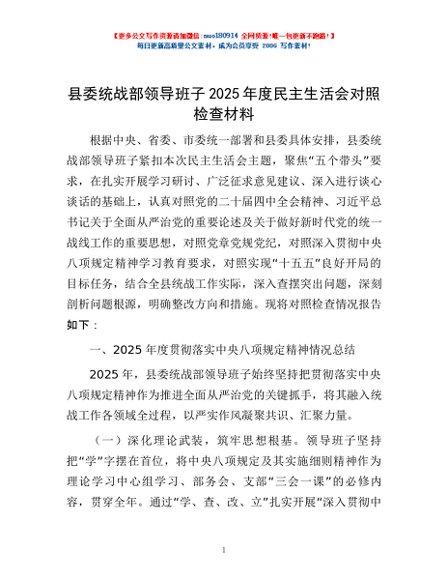 / 县委统战部领导班子2025年度民主生活会对照检查材料
