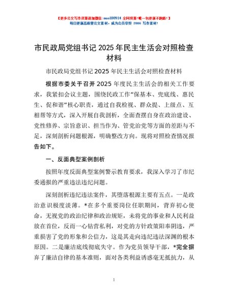 / 市民政局党组书记2025年民主生活会对照检查材料