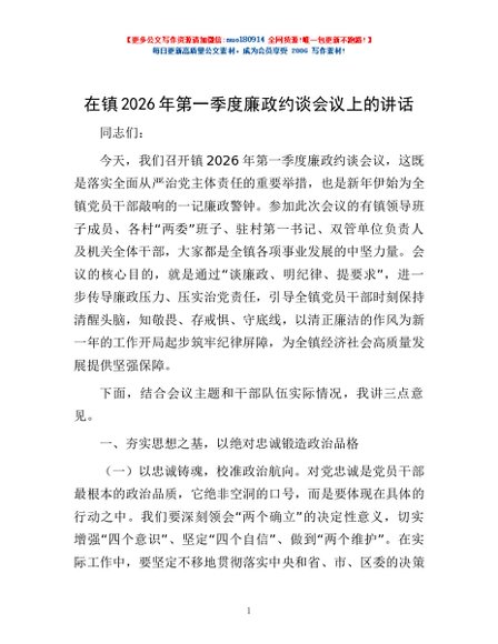 / 在镇2026年第一季度廉政约谈会议上的讲话