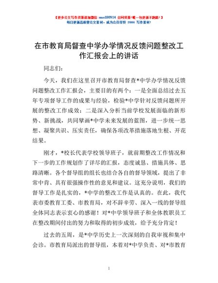 / 在市教育局督查中学办学情况反馈问题整改工作汇报会上的讲话