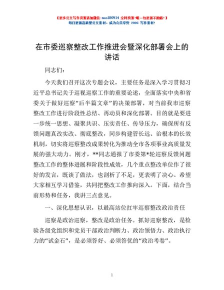 / 在市委巡察整改工作推进会暨深化部署会上的讲话