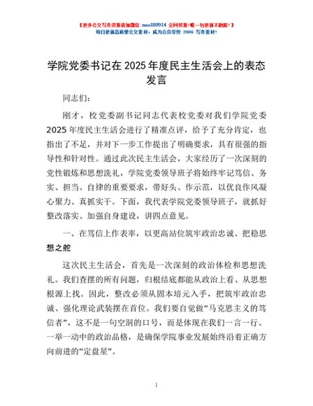 / 学院党委书记在2025年度民主生活会上的表态发言