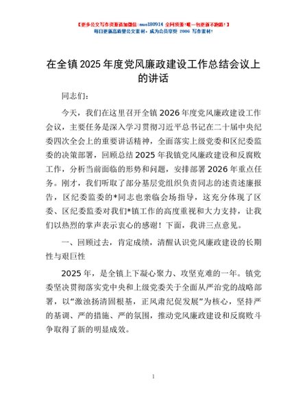 / 在全镇2025年度党风廉政建设工作总结会议上的讲话