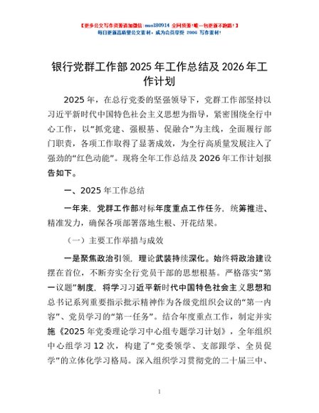 / 银行党群工作部2025年工作总结及2026年工作计划