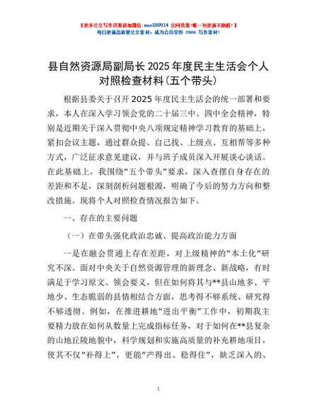 / 县自然资源局副局长2025年度民主生活会个人对照检查材料(五个带头)