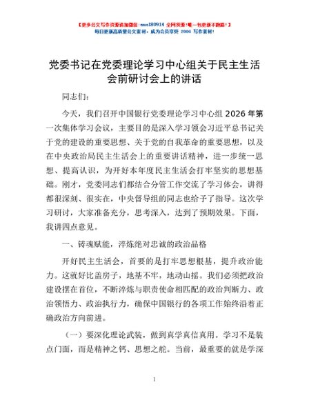 / 党委书记在党委理论学习中心组关于民主生活会前研讨会上的讲话