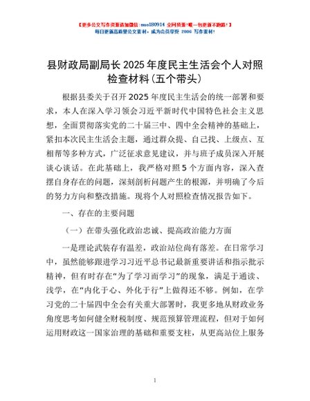 / 县财政局副局长2025年度民主生活会个人对照检查材料(五个带头)