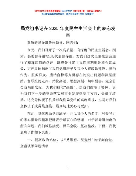 / 局党组书记在2025年度民主生活会上的表态发言