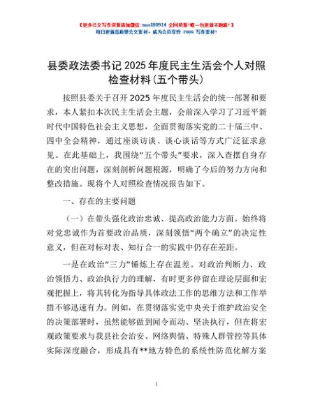 / 县委政法委书记2025年度民主生活会个人对照检查材料(五个带头)