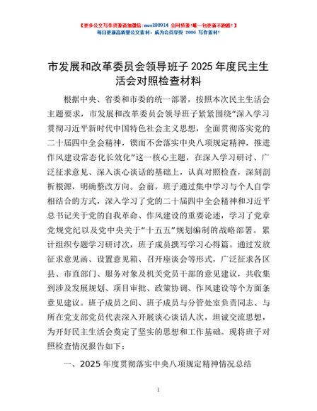 / 市发展和改革委员会领导班子2025年度民主生活会对照检查材料