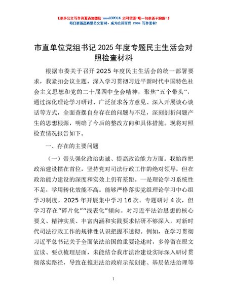 / 市直单位党组书记2025年度专题民主生活会对照检查材料