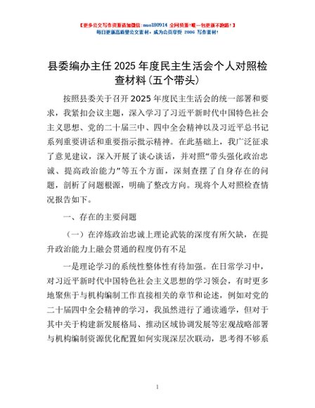 / 县委编办主任2025年度民主生活会个人对照检查材料(五个带头)
