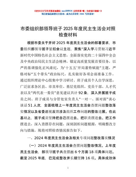 / 市委组织部领导班子2025年度民主生活会对照检查材料