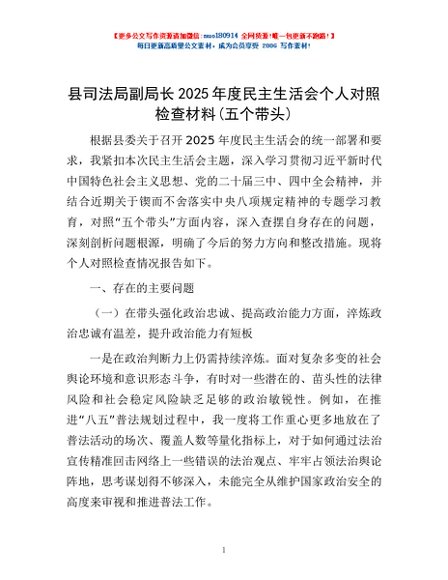 / 县司法局副局长2025年度民主生活会个人对照检查材料(五个带头)