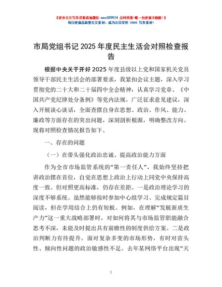 / 市局党组书记2025年度民主生活会对照检查报告