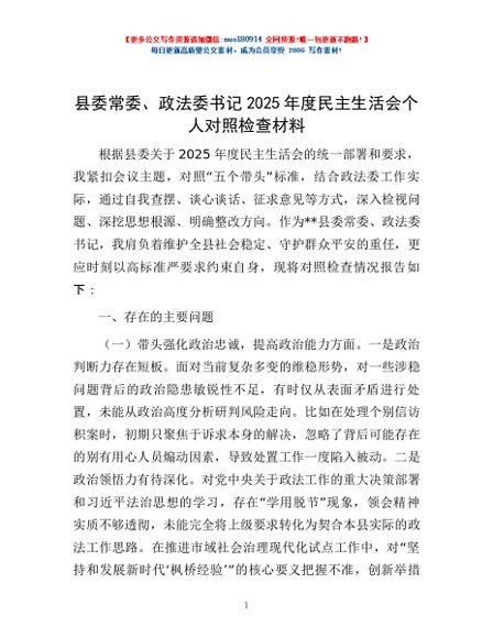 / 县委常委、政法委书记2025年度民主生活会个人对照检查材料
