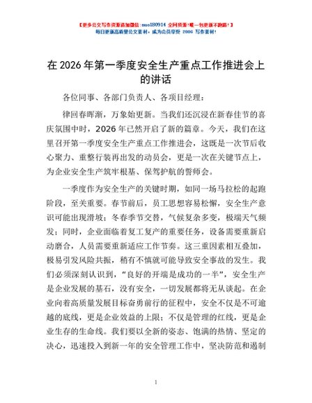 / 在2026年第一季度安全生产重点工作推进会上的讲话