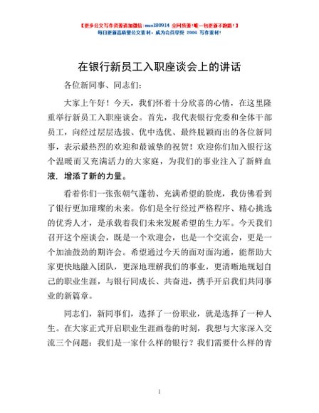 / 在银行新员工入职座谈会上的讲话