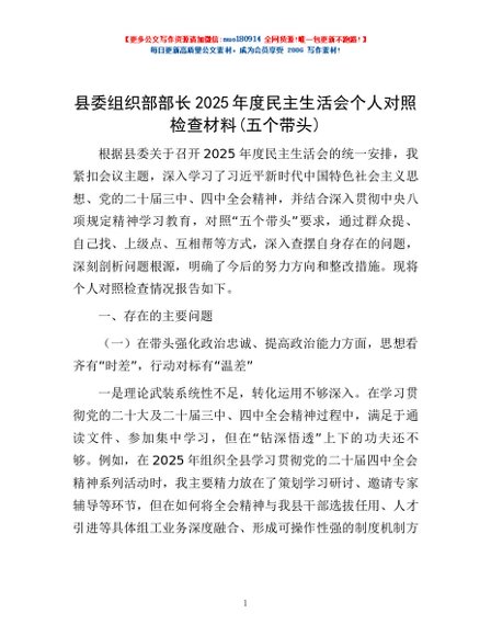 / 县委组织部部长2025年度民主生活会个人对照检查材料(五个带头)