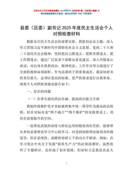 / 县委(区委)副书记2025年度民主生活会个人对照检查材料