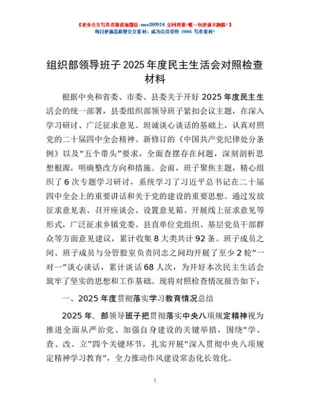 / 组织部领导班子2025年度民主生活会对照检查材料
