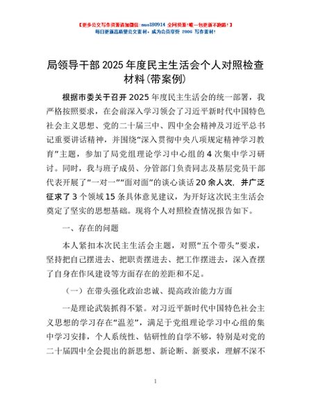 / 局领导干部2025年度民主生活会个人对照检查材料(带案例)