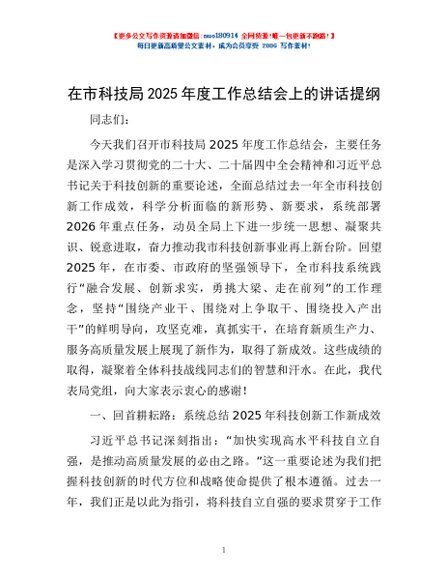 / 在市科技局2025年度工作总结会上的讲话提纲