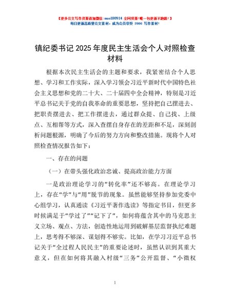 / 镇纪委书记2025年度民主生活会个人对照检查材料