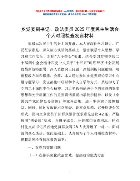 / 乡党委副书记、政法委员2025年度民主生活会个人对照检查发言材料